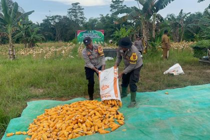 Bhabinkamtibmas Bersama Karyawan Perusahaan Panen Jagung bersama pemerintah Desa Bumi Agung